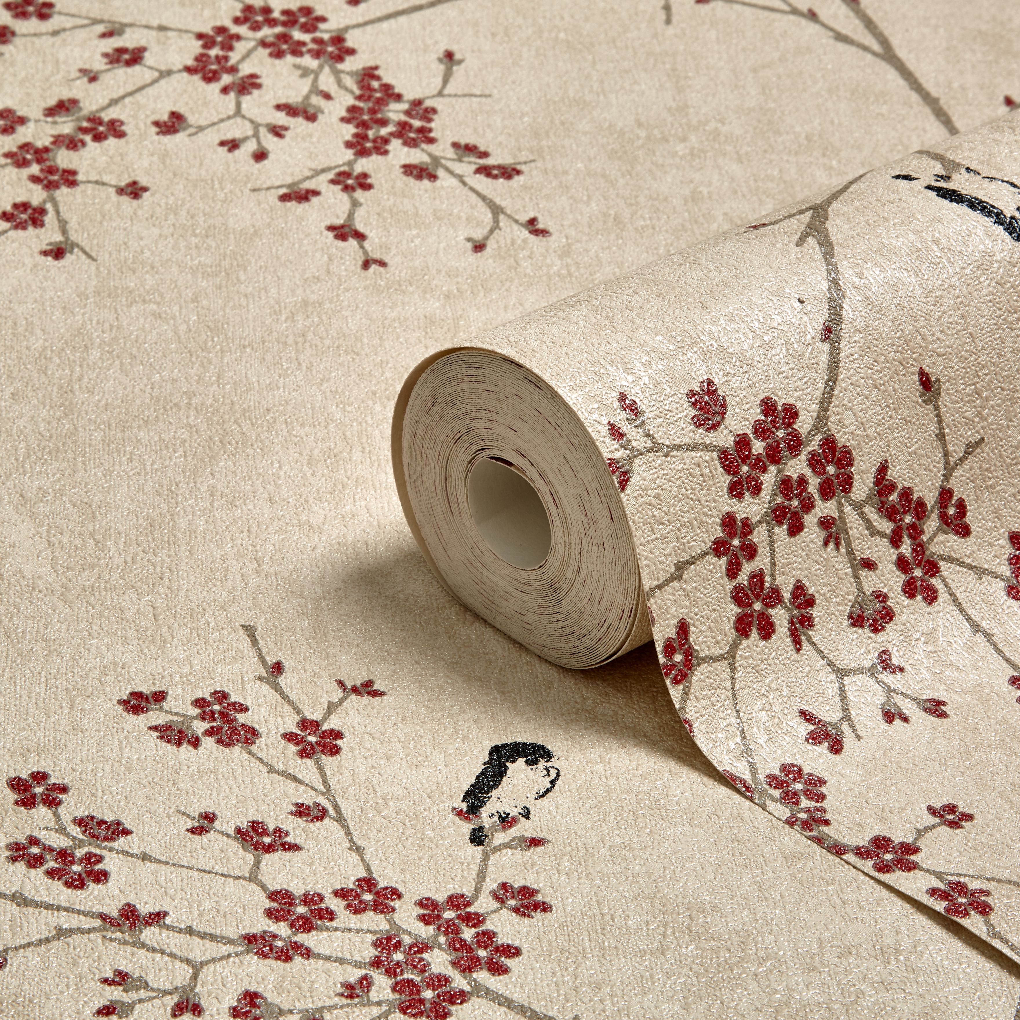 Graham Brown Beige Red Oriental Blossom Wallpaper